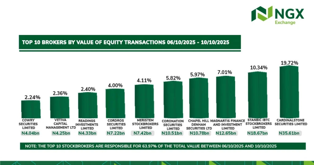 LAGOS – Trading on the Nigerian Exchange (NGX) for the week ending October 10, 2025, was heavily concentrated among a handful of leading stockbroking firms, with CardinalStone Securities Limited emerging as the clear dominant force by total transaction value.