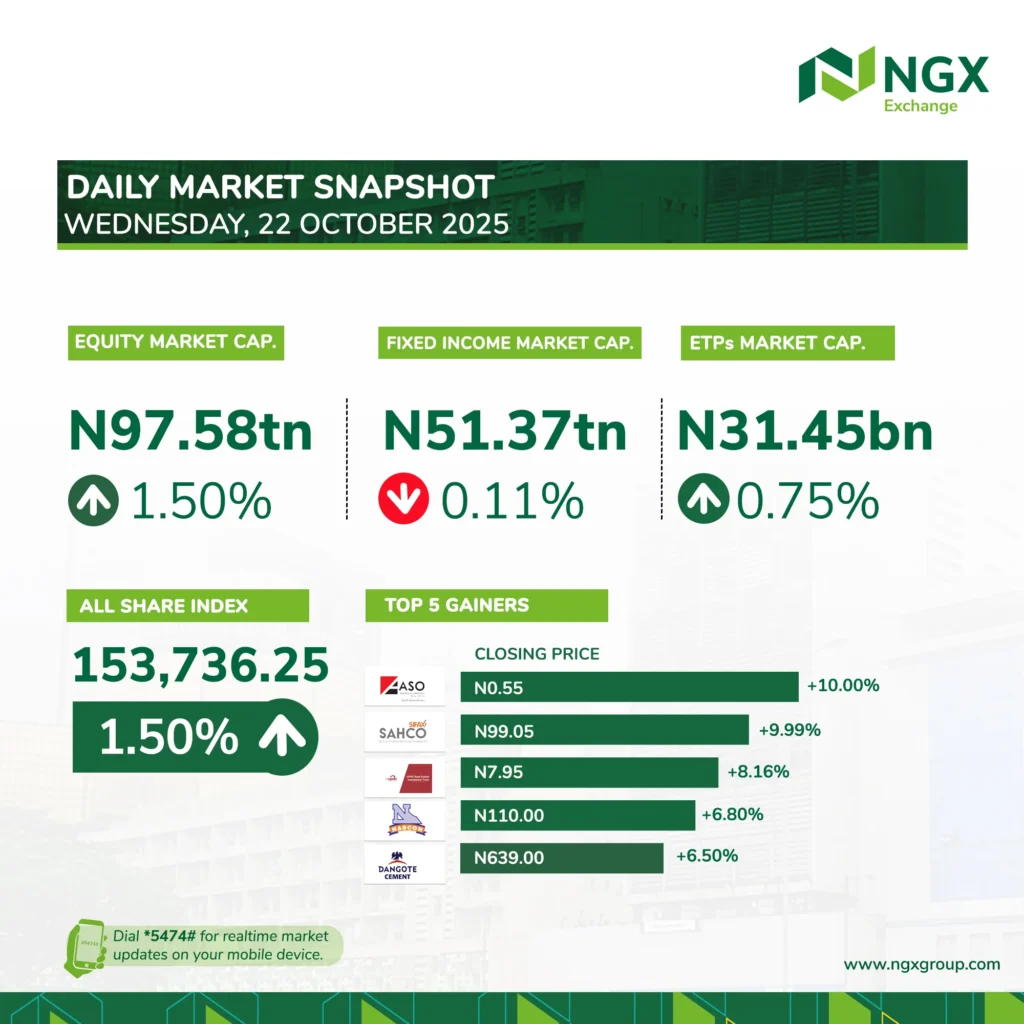 The NGX All-Share Index (ASI) surged by 1.50%, gaining 2,271.88 points to close at 153,736.25. This impressive rally propelled the total equity market capitalization to N97.58 trillion, reflecting a N1.44 trillion gain for investors.
